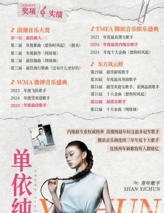 去年乐坛活跃的歌手不少,不少资深实力派,不少涌现的新人,要找个代表人物,竞争相当激烈。选择单依纯,应该是毫无争议。单依纯年龄不大,出道才几年,成绩却相当亮眼,实力不俗,天赋异禀。2025年单依纯这个昔日选秀冠军,从浙江卫视走到湖南卫视,虽然在《歌手》表现有起伏争议,但是这档节目最大的黑马,然后和周深合唱了全运会主题曲,也是各种晚会和影视主题曲的宠儿,确实能代表2025年的乐坛。