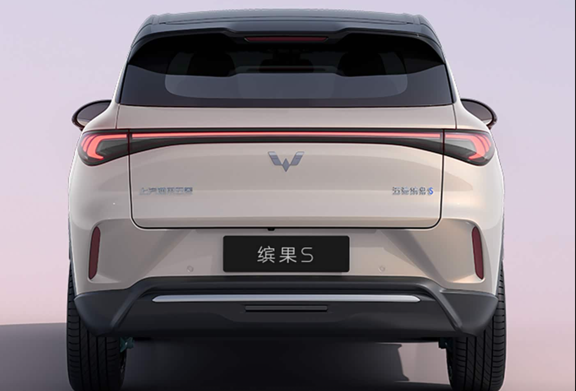 车身侧面线条修长流畅,4265mm的车长搭配2610mm的轴距,让车身比例愈发协调,彻底摆脱小型车的局促感。侧面配备双色16英寸轮辋、无漆材质下包围与轮眉,传统造型的车门外拉手简约实用,黄金配比的车高与轴距,不仅营造出舒展大气的视觉效果,更为车内充裕空间奠定了坚实基础。车尾的脉冲星环贯穿式尾灯堪称点睛之笔,红色贯穿光源搭配两侧脉冲造型,夜晚点亮后如天际线般舒展,辨识度十足;尾门右侧清晰醒目的“五菱缤果S”标识,进一步强化车型身份,彰显专属质感。